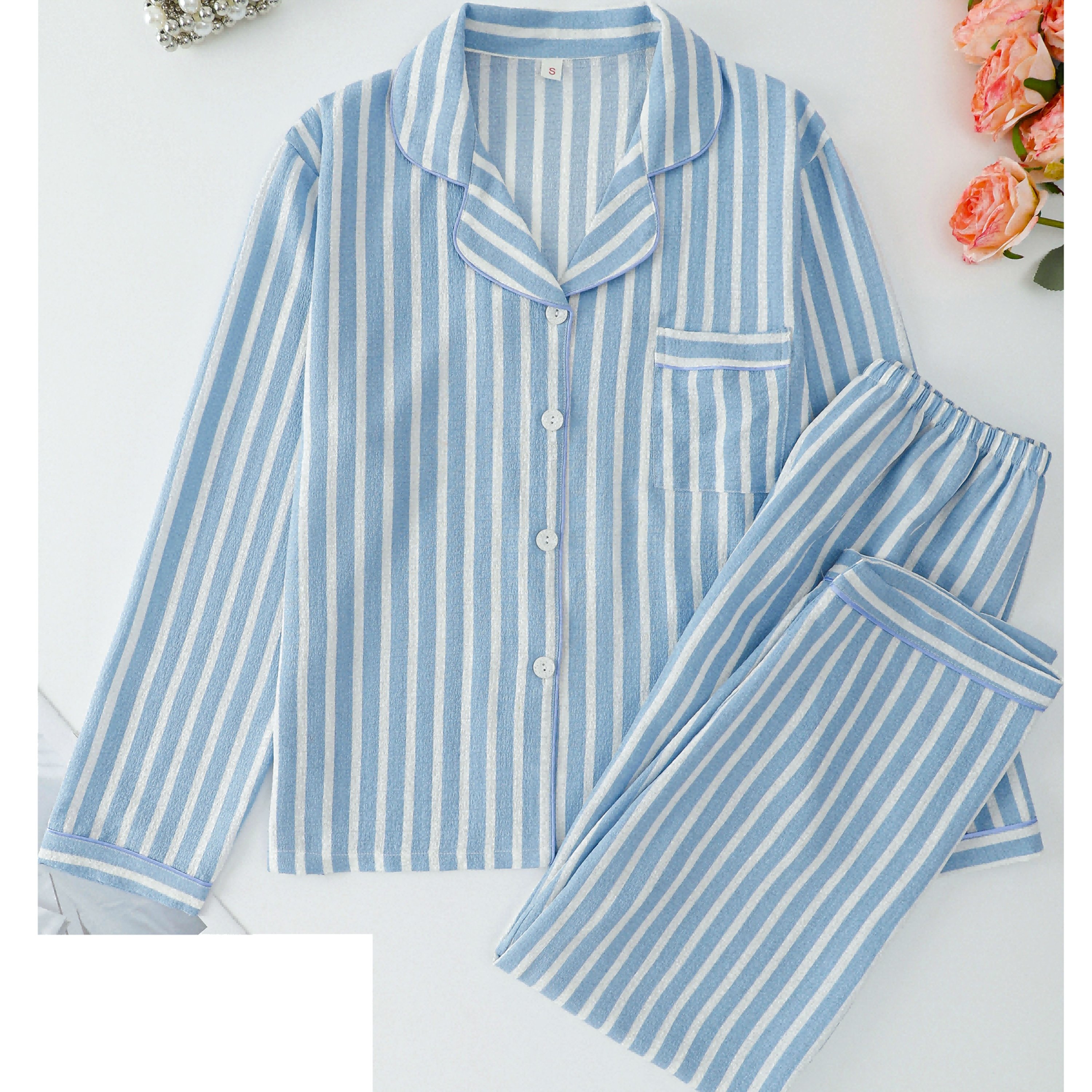 여성용 긴팔 통기성 파자마, 학생용 잠옷, 회색 줄무늬 가디건, 실내복