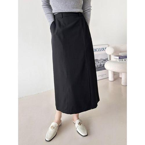 [샵앤][샵앤] 여성 뒷밴딩 슬림 2줄라인 앞트임 정장 롱스커트 NYS-WSK-4955-블랙