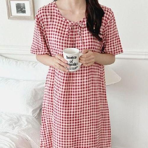 [모노무드]모노무드 여름 라운드 체크 리본 심플 루즈핏 잠옷 나시 원피스