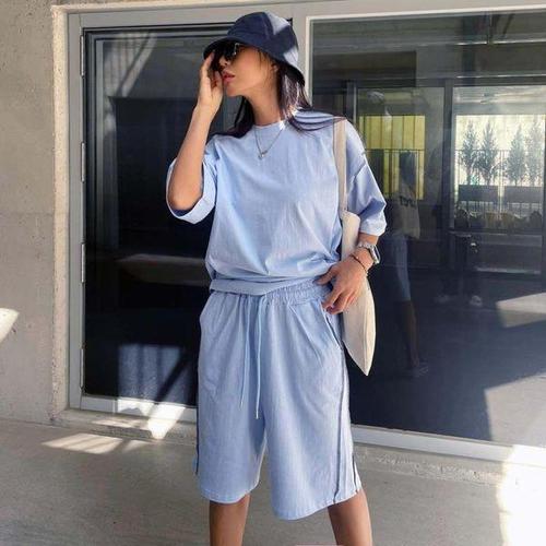 [옷자락]여자 아웃스티치 박시반팔 파랑색츄리닝 반바지 세트