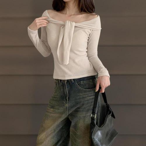 [미라클세븐]여성 리본 장식 오프숄더 긴팔 니트 티셔츠 파티용
