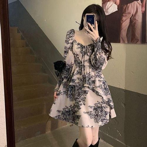 |CSO5627|여성용 리본 끈 조절 미니 드레스 잔꽃 패턴 셔링 원피스