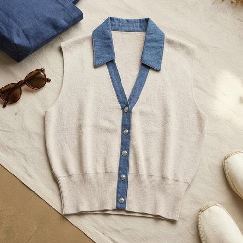 [옷자락] 여성용 데님카라 브이넥 니트조끼 가디건