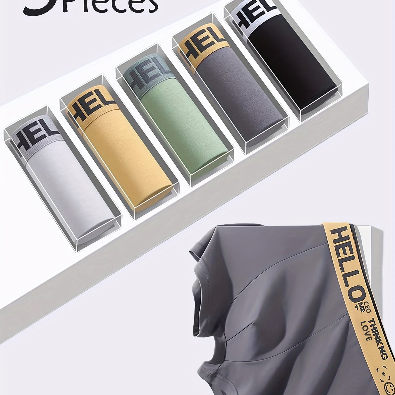 TEMU 남성용 박서 브리프 5팩, 5가지 색상 각각 한 벌씩, 레터링 프린트 탄성 허리밴드, 'hello' 허리밴드, 편안하고 통기성 좋은