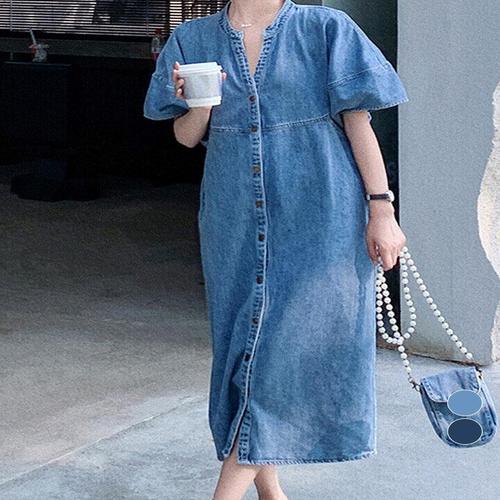 친절한탄씨 썸머 데님라이크 롱드레스 퍼프소매숏티 브이칼라 클로징 캐주얼 청원피스 CLBA1069