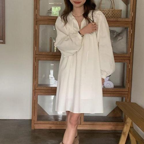 [엄지척]여자 브이넥카라 퍼프 소매 스트링 원피스_19957204_667501