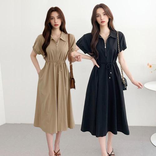 [옷자락] 여자 폴리 퍼프 반팔 카라 스트링 미디 원피스