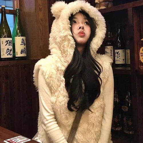 여성 퍼후드 곰돌이 조끼 귀여운 겨울 데일리룩 WFL17EZ