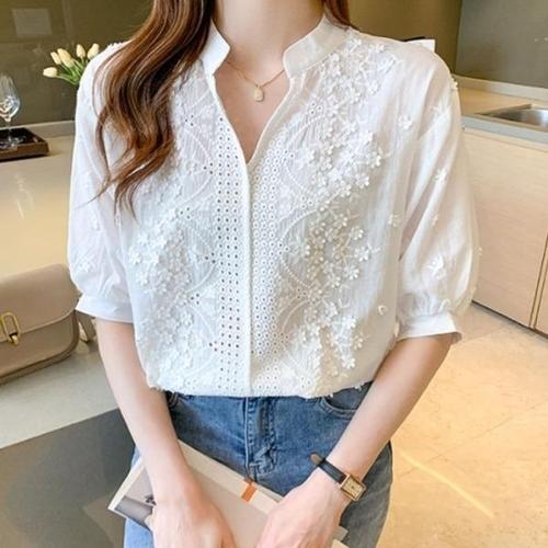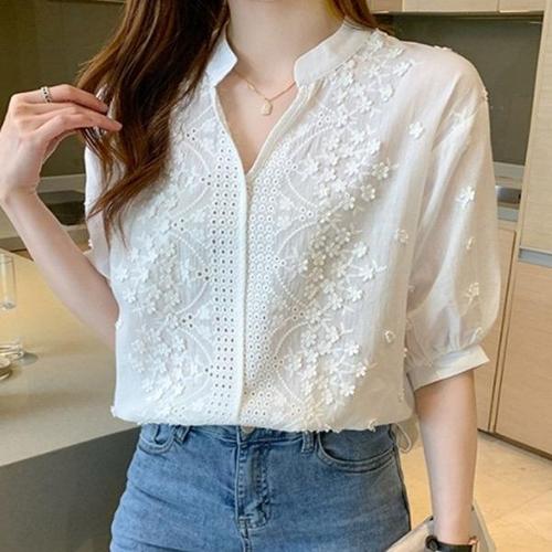 [엄지척]여성 봄 여름 반팔 브이넥 플라워 자수 펀칭 블라우스_19650454_667501