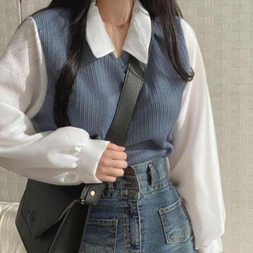 [에이치플러스몰]페이크 출근룩 오피스룩 블라우스 배색 긴팔 카라