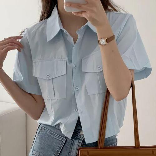 트랜디 컬러 무지 포켓 반팔 셔츠