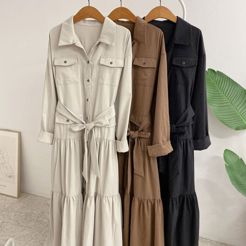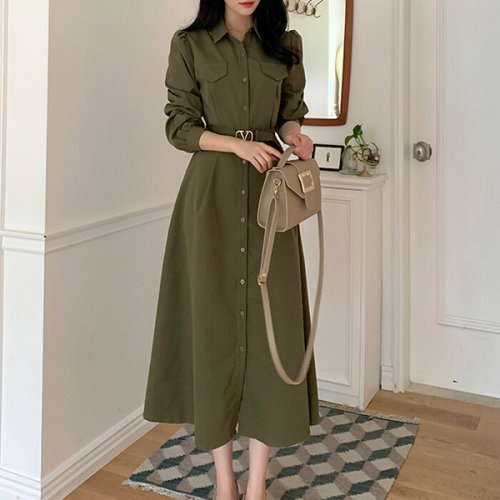 [파라노말샵](하객룩) 3색 포켓 벨트 카라 셔츠 롱 원피스 (파라노