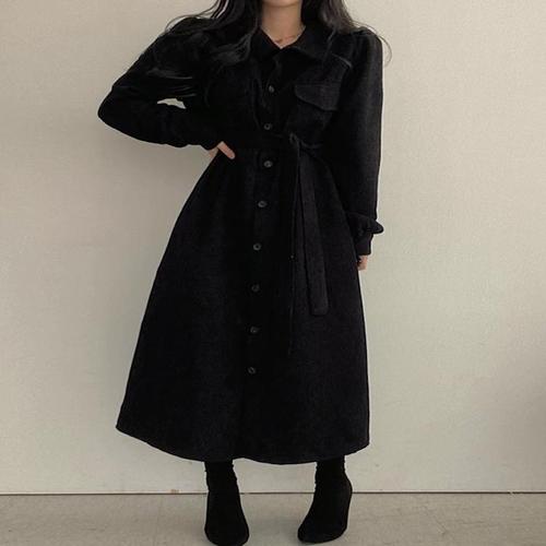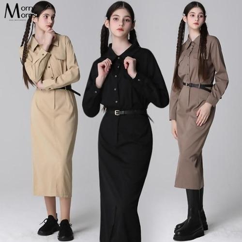[신상오픈런]여성 포켓 롱 원피스 클래식 카라넥 벨트 셔츠 드레스