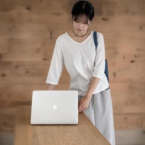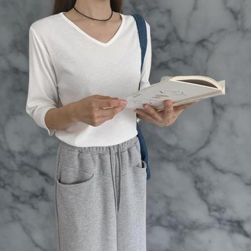 [신상오픈런]|KMT97EF|여성 폴리에스터 스판 기본 잔골지 8부 브이넥 티셔츠_22720610_597559