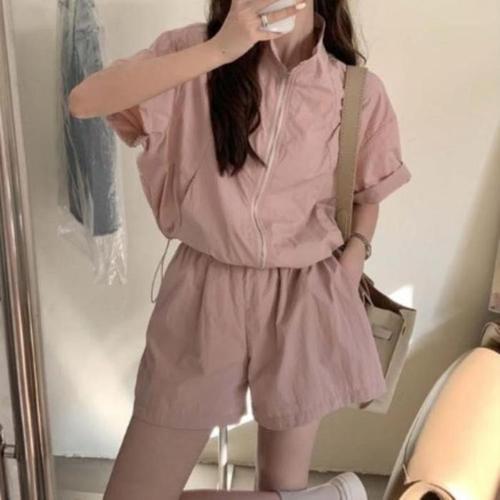 [옷자락] 여성 통기성 폴리 루즈핏 반팔 아노락 집업 반바지 세트