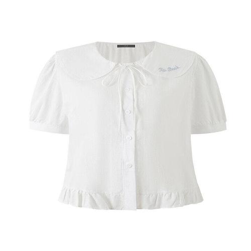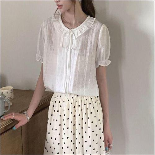 [에이치플러스몰]여름 카라 블라우스 리본 여자 러블리 반팔 프릴 2컬러