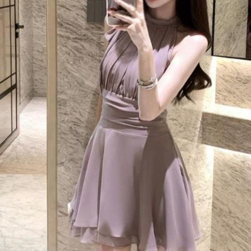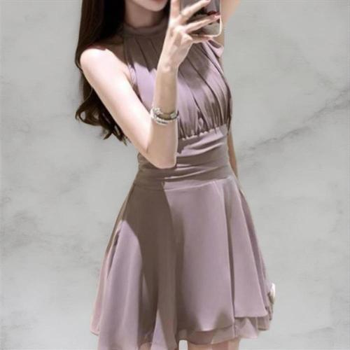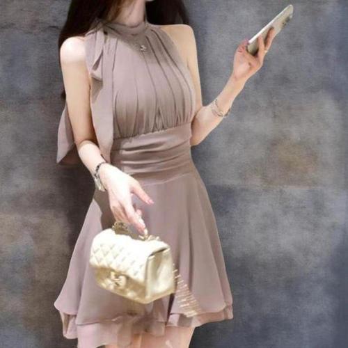 [신상오픈런]여자 찰랑핏 홀터넥 쉬폰 셔링 플레어 나시 원피스