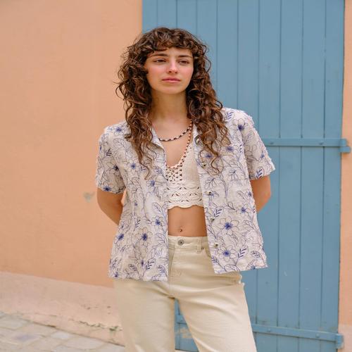 여자 코튼 카라넥 플라워포켓 자수 진청 셔츠
