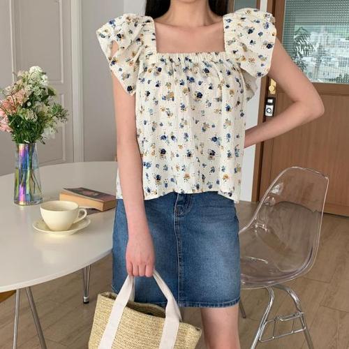 [다잇템]여자 여름 스퀘어넥 플라워 패턴 프릴 블라우스