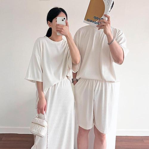 [옷자락]여자 남자 여름 커플룩 루즈핏 플리츠 치마 바지 세트