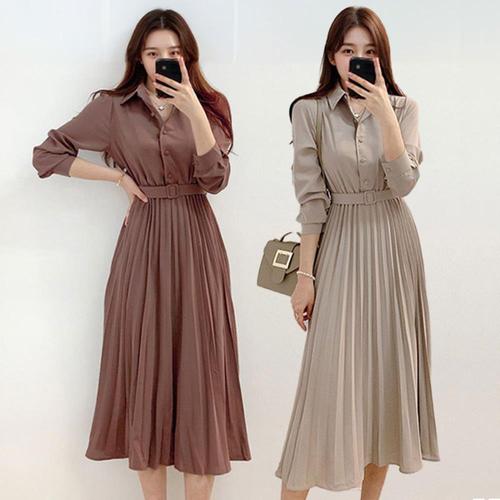 여자 봄가을 간절기 벨티드 플리츠 셔츠형 롱원피스