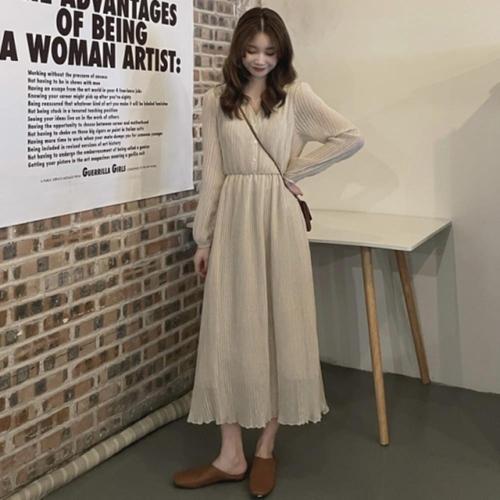 [옷자락]여자 봄여름 간절기 시원한 구김없는 브이넥 플리츠 롱원피스