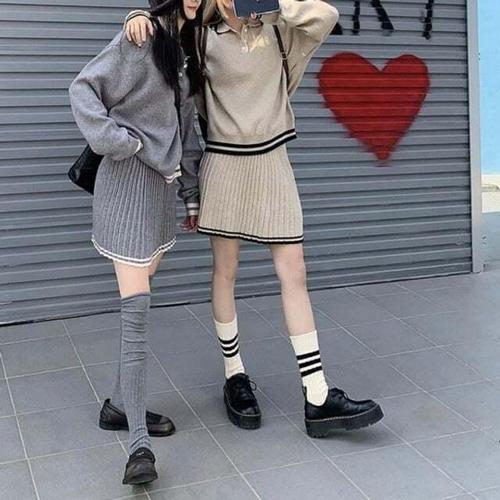 [셀럽하우스]배색 HQWT1575 카라 니트 데일리 플리츠 스커트 투피스 세트