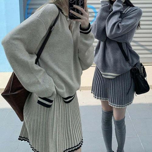 [셀럽하우스]배색 ZCFV6977 카라 니트 플리츠 스커트 투피스 세트 MFNC-0401