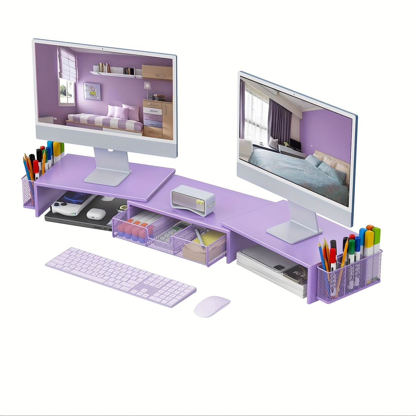 TEMU 서랍 및 펜 홀더 2개가 있는 듀얼 모니터 스탠드, 조절 가능한 금속 데스크 정리함, 사무용품 및 작업 공간 정리대, 남녀 선물용 홈 데스크 오거나이저|모니터받침대