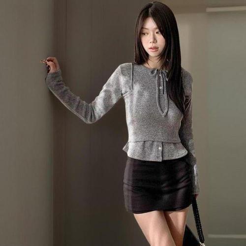 [신상오픈런]여성 슬림핏 끈 크롭 니트 가디건 세트