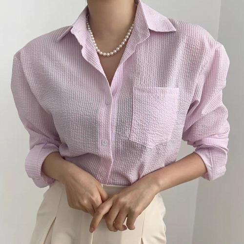 [셀럽하우스]셔츠 YIOH4630 일상복 슬림 파워숄더 단가라 연핑크 봄옷