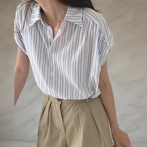 [옷자락] 여성 클래식 스트라이프 핀턱 하늘색 반팔 셔츠
