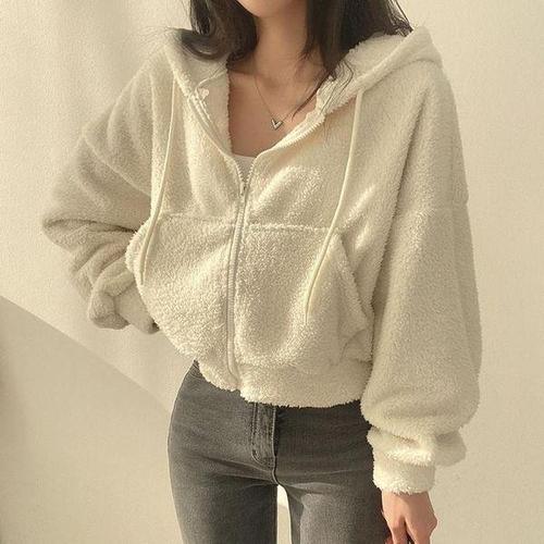 아이보리 크롭 뽀글이 후드집업 여성 하이틴 데일리룩