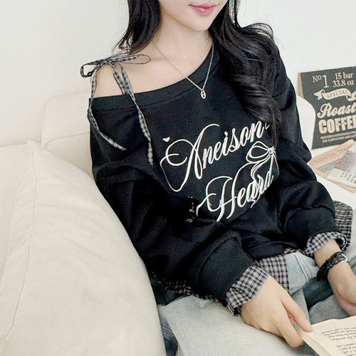 코키코키 / 캐주얼힙/하이틴룩 에샤 체크 셔츠 레이어드 원숄더 맨투맨