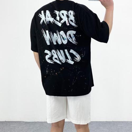 [엠클로]남자 오버핏 코튼 브레이크 다운 핸드페인팅 레터링 프린팅 반팔티셔츠 남여공용 2컬러