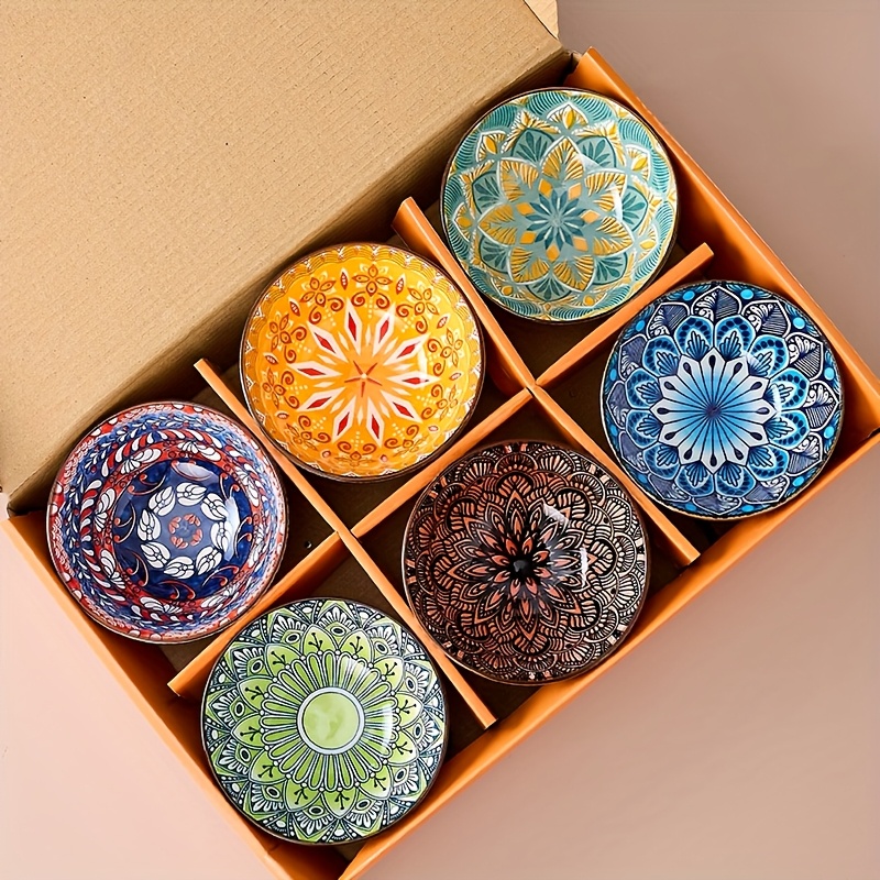 TEMU 스타일 세라믹 볼 6개 세트 - 생동감 넘치는 만다라 디자인, 식기세척기 및 전자레인지 사용 가능 - 시리얼, 수프, , 샐러드에 적합 - 집들이 선물이나 기념품으로 완벽한 선택 | 패턴이 돋보이는 포슬린 제작|전자레인지|식기세척기|식기세척기