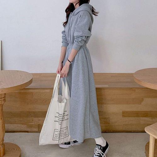 [모노무드]모노무드 롱원피스 시보리 허리밴딩 후드 캐주얼 롱 플레어 원피스