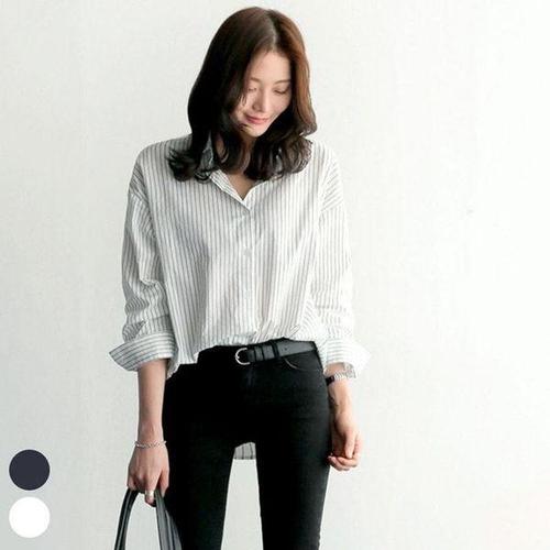 [에이치플러스몰]여성 니트매치 셔츠 가을 스트라이프 루즈핏 출근룩 레이스나시 형광티셔츠 여성 긴팔티..