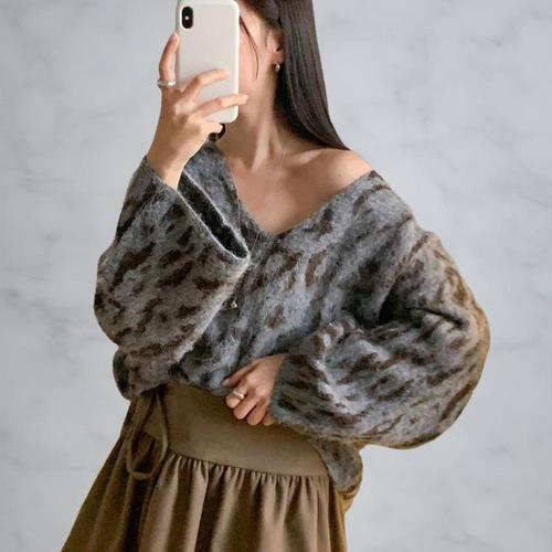 [다잇템]여자 호피 퍼 딥브이넥 박스핏 헤어리 니트