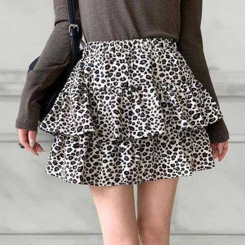 [옷자락]여성 호피 레오파드 캉캉 프릴 밴딩 미니 스커트