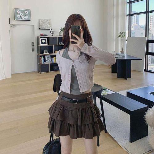 [BONNIE J]홀터넥 나시 가디건 세트 어깨트임 레이어드 니트 티셔츠