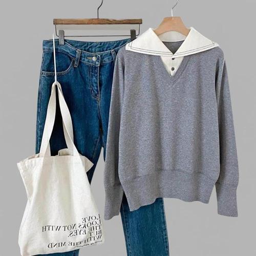 [다잇템_패션]여자 코디 데일리 남방 카라넥 민무늬 니트
