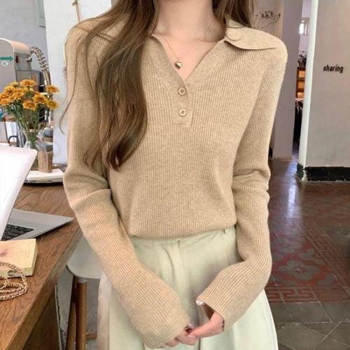 여성용셔츠칼라 골패턴 V넥 데일리룩 니트웨어