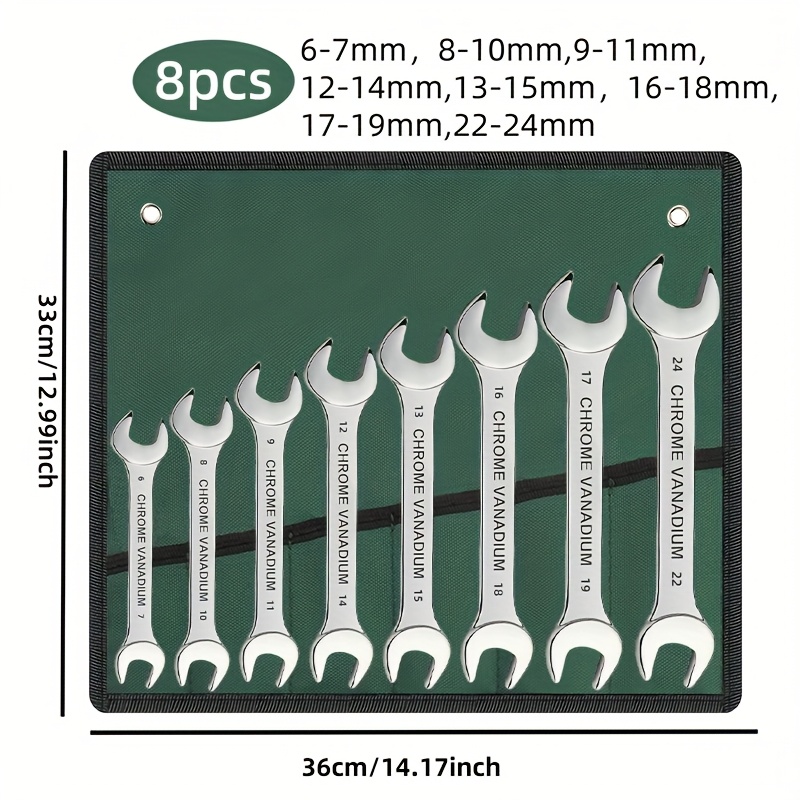 TEMU 8개 양방향 오픈 엔드 렌치 세트, , 자동차 수리 및 산업용 도구 (배관 작업)에 적합, 롤업 가방 포함. 가정 수리에 이상적. 각 렌치는 양쪽 끝에 다른 크기를 갖고 있어 하나의 렌치로 두 개를 대체할 수 있습니다.
