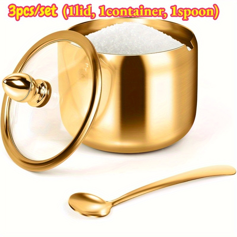 TEMU 3개/세트(뚜껑 1개, 용기 1개, 스푼 1개) 골든 스테인리스 스틸 양념 보관 세트, 30가지 용도, 투명 유리 뚜껑 및 스푼 포함, 식기세척기 사용 가능, 넓은 입구, 다목적 양념 디스펜서, 커피 바 및 주방 정리에 적합