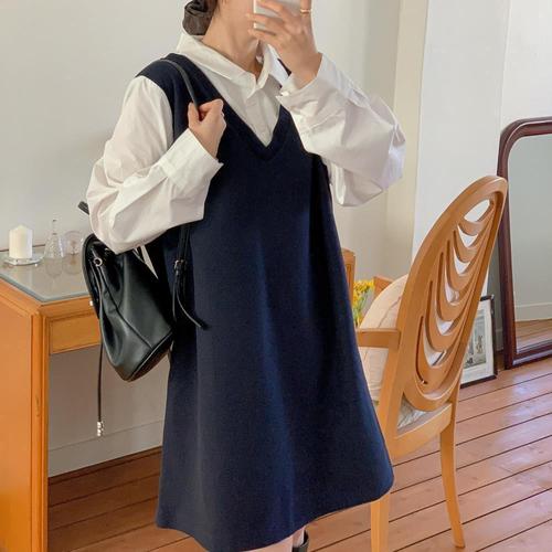 [미라클세븐]여성 하객룩 레이어드 브이넥 흰색 박시 미디 드레스