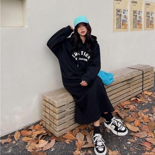 리파니 루즈핏 맨투맨 옆트임 기모 후드 롱 원피스