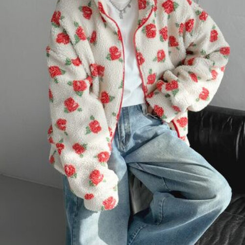 에르디테 / 플라워 양털 하이넥 후리스 집업 자켓 루즈 오버 핏 빅사이즈 2컬러