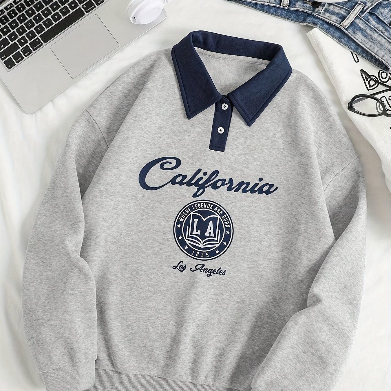 TEMU 캘리포니아 프린트 칼라 풀오버 스웨트셔츠, 캐주얼 롱슬리브 크루넥 스웨트셔츠 가을 & 겨울, 여성 의류