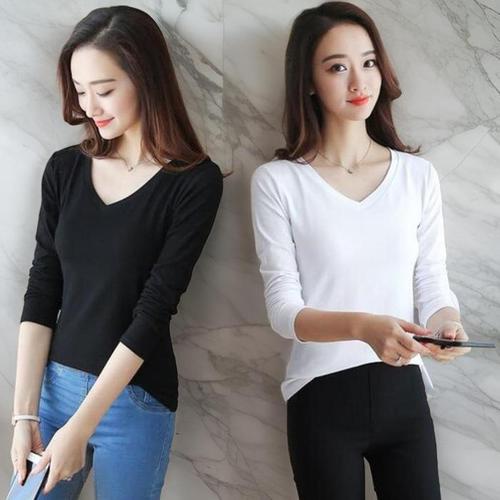 [다잇템]여자 V넥 롱슬리브 흰색 베이직 민무늬 티셔츠 (29321589A)